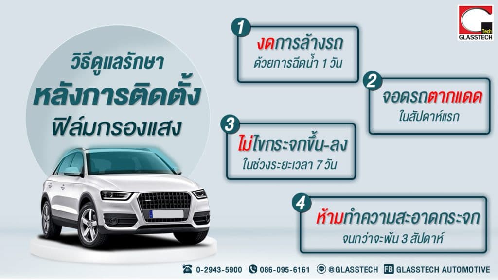 หน้าแรกข่าวสาร/บทความวิธีดูแลหลังติดตั้งฟิล์มกรองแสง วิธีดูแลหลังติดตั้งฟิล์มกรองแสง 10 July 2021 Share FacebookTwitterEmailLINE วิธีดูแลรักษา หลังการติดตั้งฟิล์มกรองแสง วิธีดูแลรักษาหลังการติดตั้ง ฟิล์มกรองแสงรถยนต์ ทำตามนี้ ฟิล์มติดไวแน่นอน!1. งดการล้างรถด้วยการฉีดน้ำล้าง 1 วัน2. พยายามจอดรถ ตากแดด ภายในสัปดาห์แรก3. ในช่วงระยะเวลา 7วัน หลังการติดตั้งฟิล์มไม่ควรไขกระจกขึ้น – ลง4. ห้ามเช็ดถู หรือทำความสะอาดกระจกภายในตัวรถ จนกว่าจะพ้น 3 อาทิตย์. ศูนย์บริการใกล้ท่าน พร้อมบริการนอกสถานที่ ครอบคลุมทั่วกรุงเทพ และปริมณฑลสาขา รามอินทรา กม.4 สำนักงานใหญ่สาขา ศรีนครินทร์สาขา รัตนาธิเบศร์สาขา นราธิวาสราชนครินทร์สาขา พระราม 5สาขา คลองหลวง-ตลาดไทสาขา รังสิต-ธัญบุรี คลอง7ศูนย์รวมฟิล์มรถยนต์ ทุกรุ่น ทุกยี่ห้อ ครบจบในที่เดียวสามารถจองผ่านช่องทางออนไลน์ พร้อมรับโปรโมชั่นดีๆ ทุกๆเดือน ได้ที่ Inbox หรือCall Center : 02-943-5900Hotline : 086-095-6161Line@ : @glasstechWebsite : www.glasstech.co.thFacebook : Glasstech AutomotiveInstagram : glasstech_automotiveYoutube : Glasstech Thailand Channel บทความอื่นๆ Hi-Kool Ceramic Black Night Hi-Kool UV Care 4 ข้อดี ฟิล์มเซรามิค Glasstech is Happiness ฟิล์มที่เราให้บริการ ตัวอย่างลูกค้าติดฟิล์ม Hi-kool Ceramic Black Night ตัวอย่างลูกค้าติดฟิล์ม Hi-kool UV Care ตัวอย่างลูกค้าติดฟิล์ม 3M Ceramiv Ultra Clear ขอขอบคุณลูกค้ากว่า 1 ล้านคัน ที่ไว้วางใจ ให้ GLASSTECH ดูแล ดูรีวิวเพิ่มเติม Share FacebookTwitterEmailLINE
